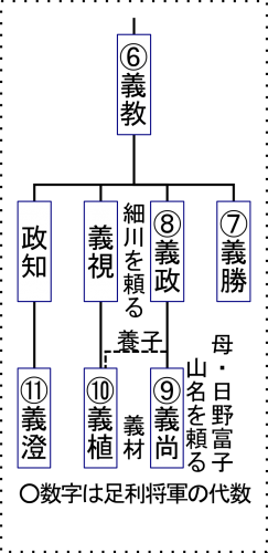 将軍義政には後継ぎとなる男子がいなかった。だから義政は、自分の弟の義視(よしみ)を9代将軍にすると約束したんだ。ところが、皮肉にも、その後に、義政の正室であった日野富子との間に男の子が生まれたんだ。それが義尚(よしひさ)という。