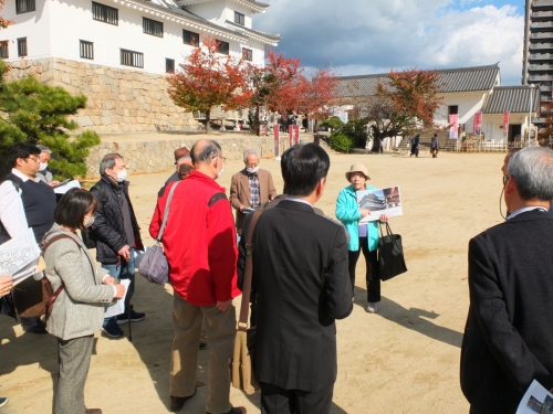 福山城で観光ボランティアガイドさんの説明を受ける |