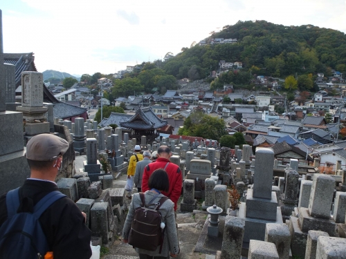 この千光寺山の頂上から、しまなみ海道つたいに対岸の四国まで広がる眺望を楽しんだ後に、文学碑が随所に設置されている小径を下ります。昔は砦の跡であったと言われる、巨岩や岩肌を巧みに活かした千光寺境内を参拝して、徐々に近づいてくる麓の景色を楽しみながら、天寧寺まで下ってきました。