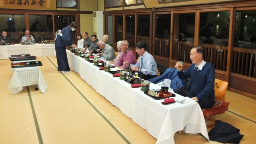 天寧寺から麓のバス駐車場へ着くと時刻は5時を少し回っており、周囲は既に暮色に包まれていました。ここでバスに乗車し宿舎のホテルに一旦チェックインして、その後、総会と懇親会の会場である竹村家へと移動をしました。