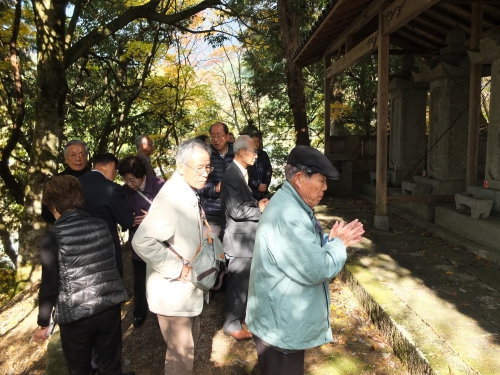 昼食後は最後の因幡守護職であり、村岡山名初代の山名豊国公の廟所を参拝する予定でしたが、昼前から時折雨が混じる強い風が吹くようになり、高原にある豊国公の廟所参拝は諦め、代わりに村岡山名三代・矩豊公から十代・義問公までの大名墓が整然と並ぶ壺渓御廟の参拝に変更しました。御廟では村岡山名後継の山名義英副総裁に引き続いて参加者全員で、村岡山名歴代の墓前に線香をお供えさせていただきました。