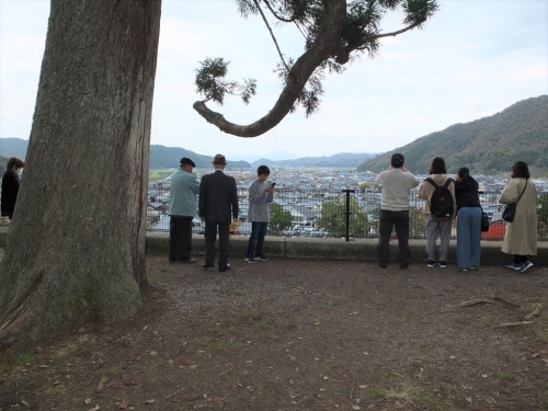 平成25年に出石で総会を行ったおりには、時間の関係で出石城は遠目に眺めるだけでしたが、今回は出石城中腹にある有子山稲荷を目指し、山名氏時代の有子山城の姿を思いつつ、参道を登りました。